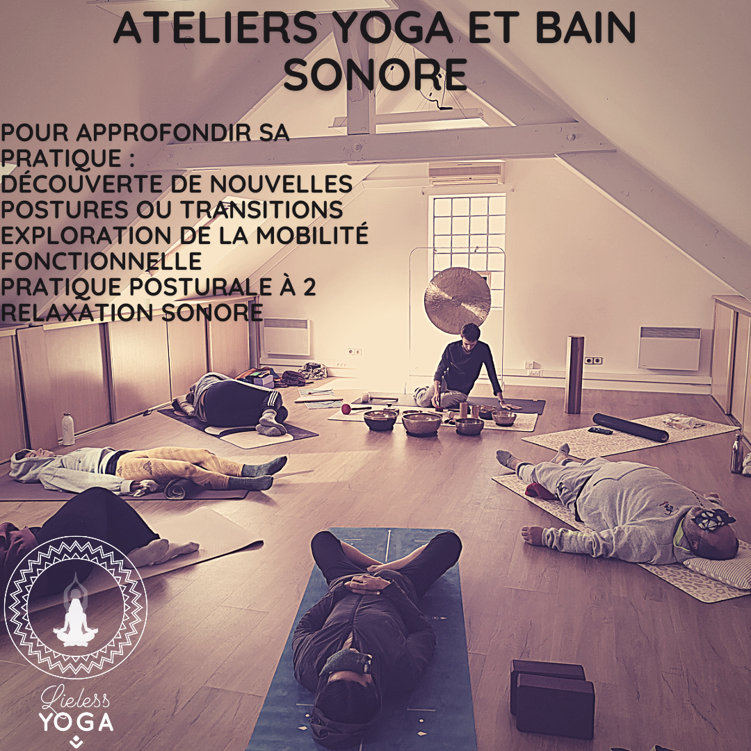 Les ateliers yoga et bain sonore se composent de 2h de pratique du yoga : découverte de nouvelles postures ou transitions, exploration de la mobilité fonctionnelle, pratique posturale à 2 ainsi que 30 minutes de relaxation sonore pour un apaisement profond du système nerveux, du corps et de l'esprit.